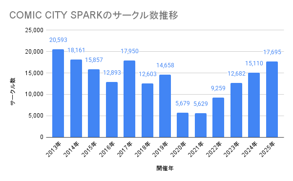 ただ2019年スパーク、なかなか難しいイベントで……当初は2日連続開催予定が、1日目が台風の接近によりイベント直前に中止し、2日目開催。代替イベントとして1か月ほど置いて新設された3日目が開催されてます。スペース数は確定していたので1日目もカウントできますが、しかし実際には開催されなかったイベントをカウントしちゃうのはなとか、急遽追加された3日目はどう扱えばいいんだろうなとか。今回は開催実績があるという意味で2日目と3日目の合算値としています。