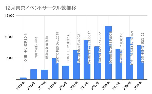 あのどこ更新しました in 東京152 あのどこ更新しました in 東京152 2025年最後の集計わよ https://anodoko.net/blog/ あんまり書くことがないんですけど、冬コミ直前のこの時期に8000サークル集まるというのは、本当に隔世の感がありますね。 ここ数年は赤ブーとコミケでサークル層が分かれているのではとよくいわれてますが、個人的に、スパコミみたいにもともと超巨大なイベントに人が集まってることよりも(それはもう以前からずーっと人が集まってるイベントだっただろって)、夏冬コミケ直前時期のイベントにめーっちゃ人が集まってる方が「本当にコミケ外してこっち来ているんだなあ」と感じます。 試しにグラフだしてみたものの、固定のイベントというのはあんまりない時期なので、比較としてはよくわかんないですね。ただ、「すきま時期」ではあるんで、単独オンリーイベントや投票型CPイベントという「ニッチながらに固定参加者が見込めそうなイベント」が開催されていた時期ではあったのかも。 それで今回の冬季投票型CPイベントは12月から2月に移動したので、そこにオールジャンルイベントを開いてみたら8000サークル集まってるのは、これまでともう一段モードが変わった感じあります。 ほんなら来年は……っと、いまスケジュール見に行ったら、来年12月はまたDOZEN ROSE FES(投票型CPイベント)なのである! 次回の投票型は日程分散させなかったのね。確かまだぎりぎりビッグサイトの改修期間とかぶっているはずですが、どのくらいの規模になるのかちょっと予測がつかないかも。 今年の振り返り記事も準備中です。以前から予告していたnoteの準備も並行していると、思ったより時間がない! がんばります。 https://note.com/anodoko #あのアレどこ 活動履歴 2025/12/17(Wed) 21:05:29